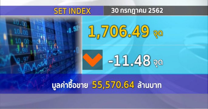 ตลาดหุ้นไทยวันนี้ปิดที่ 1,706.49 จุด ลดลง 11.48 จุด มูลค่าการซื้อขาย 55,570 ล้านบาท