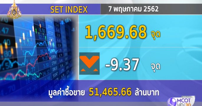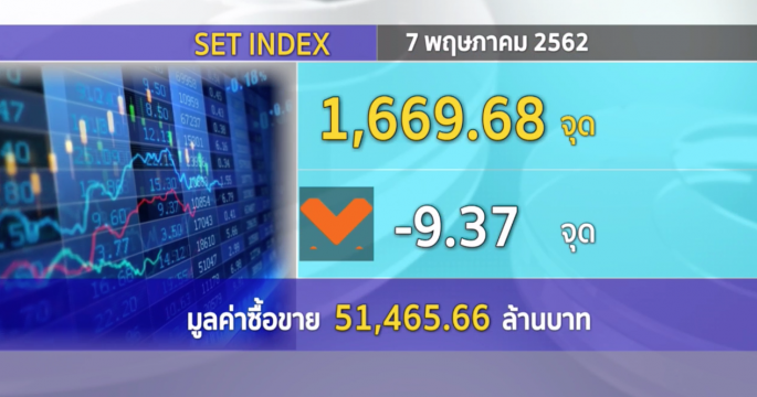 หุ้นไทยปิดวันนี้ (7 พ.ค.) ที่ระดับ 1,669.68 จุด ลดลง 9.37 จุด มูลค่าการซื้อขาย 51,465.66 ล้านบาท เนื่องจากมีความกังวลสงครามการค้าระหว่างสหรัฐและจีน และยังต้องจับตาการเมืองในประเทศ
