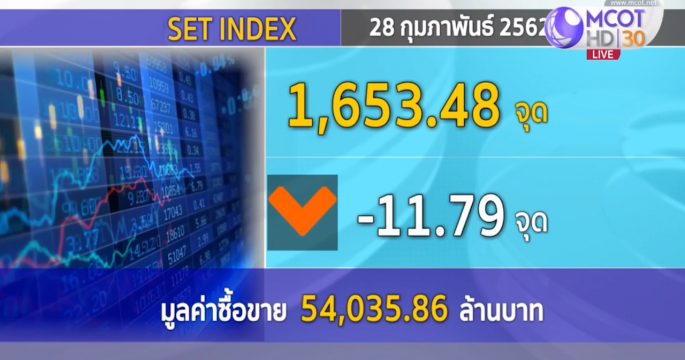 วันนี้ดัชนีตลาดหลักทรัพย์ของไทยปิดลดลงไป 11.79 จุด ดัชนีอยู่ 1,653.48 จุด ปริมาณการซื้อขาย 54,035.86 ล้านบาท