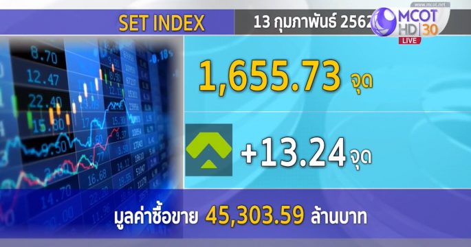 ตลาดหุ้นไทย (13 ก.พ.) ปิดการซื้อขายที่ 1,655.73 จุด บวก 13.24 จุด มูลค่าการซื้อขาย 45,303.59 ล้านบาท