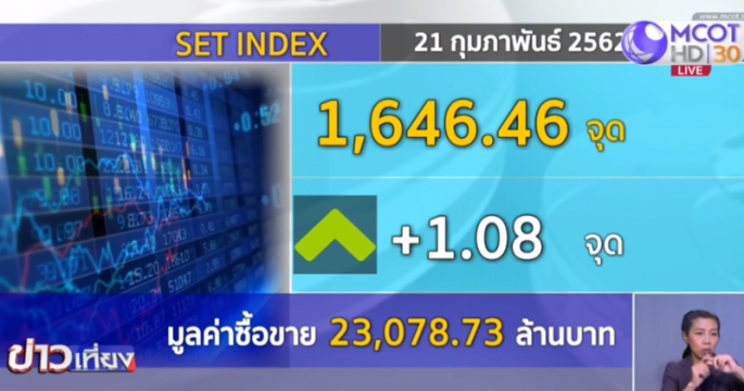ดัชนีหุ้นไทยช่วงเที่ยงปิดบวก 1.08 จุด อยู่ที่ 1,646.46 จุด มูลค่าการซื้อขาย 23,078.73 ล้านบาท