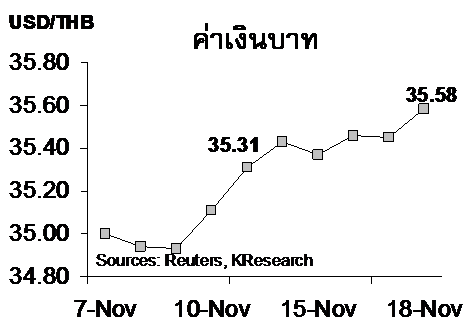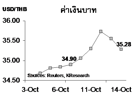 ธนาคารกสิกรไทย ประเมิน สัปดาห์หน้า ( 17-21 ต.ค.)เงินบาทเคลื่อนไหว 34.95-35.50 บาทต่อดอลลาร์ฯหลังสัปดห์ที่ผ่านมาแตะระดับต่ำสุดในรอบ 8 เดือน ด้าน บริษัทหลักทรัพย์กสิกรไทย จำกัด มองว่า ดัชนีหุ้นไทยมีแนวรับที่ 1,450 และ 1,430 จุด ขณะที่ แนวต้านอยู่ที่ 1,490 และ 1,515 จุด ตามลำดับ
