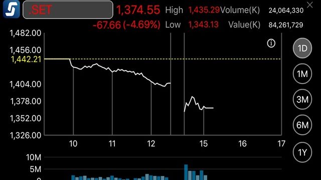 ตลาดหุ้นไทย เปิดการซื้อขายในช่วงภาคบ่าย ลดลงแรงถึง 99 .08 จุด ดัชนีหลุด 1,400 จุด ลงไปต่ำสุดที่ 1,343.13 จุด โดยมีแรงขายออกมาอย่างหนักในหุ้นทุกกลุ่ม