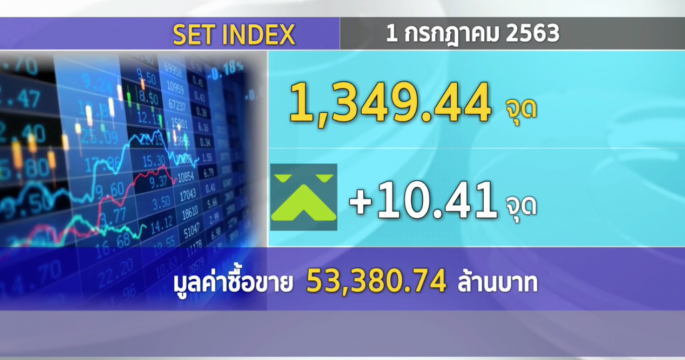 ตลาดหลักทรัพย์ฯ ปิดวันนี้ (1 ก.ค.) ที่ระดับ 1,349.44 จุด เพิ่มขึ้น 10.41 จุด 0.78% มูลค่าการซื้อขาย 53,380.74 ล้านบาท โดยดัชนีเคลื่อนไหวแดนบวกเป็นส่วนใหญ่ ทำระดับสูงสุด 1,350.16 จุด และทำระดับต่ำสุด 1,331.60 จุด.