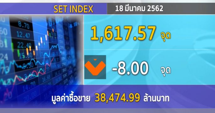 ตลาดหุ้นไทย (18 มี.ค.) ปิดการซื้อขายที่ 1,617.57 จุด ลบ 8.00 จุด มูลค่าการซื้อขาย 38,474.99 ล้านบาท