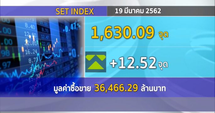 ตลาดหุ้นไทย (19 มี.ค.) ปิดการซื้อขายที่ 1,630.09 จุด บวก 12.52 จุด มูลค่าการซื้อขาย 36,466.29 ล้านบาท