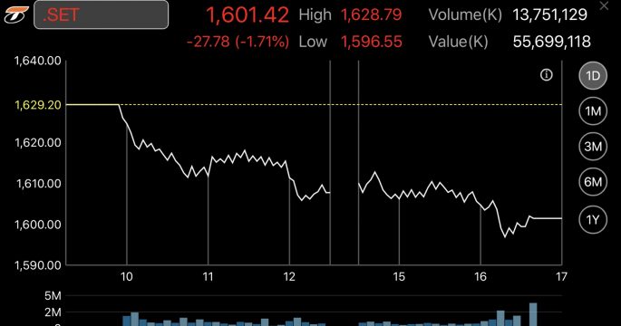หุ้นไทยร่วงต่อ 27.78 จุด แรงขายหนักกังวลผลกระทบสงครามการค้า ดัชนีปิดที่ 1,601.42 จุด