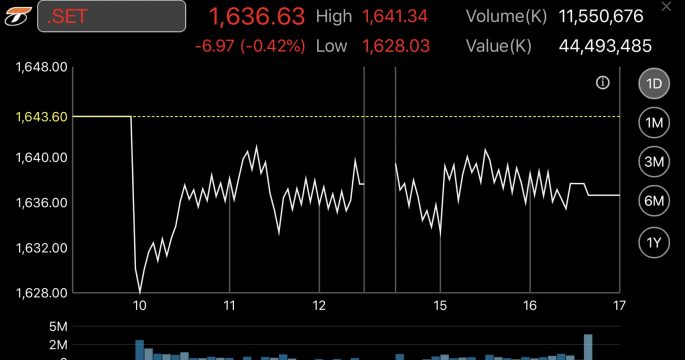 ดัชนีตลาดหุ้นไทยปิดที่ 1,643.52 จุด เพิ่มขึ้น 2.59 จุด หรือ ร้อยละ 0.16 มูลค่าการซื้อขาย 37,635.36 ล้านบาท