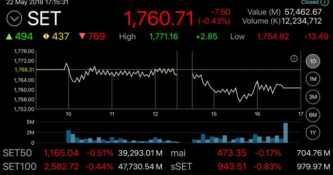 หุ้นบวก 14.14 จุด รับข่าวดีจีดีพีไตรมาสแรกโตเกินคาด ดัชนีปิดที่ 1,768.31 จุด มูลค่าซื้อขายกว่า 47,000 ล้านบาท