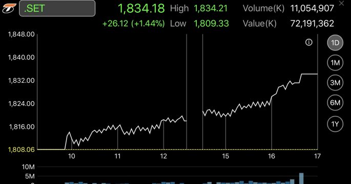 หุ้นไทยบวกแรงเกือบ 20 จุด ยืนเหนือ 1,800 จุด ตามตลาดต่างประเทศ