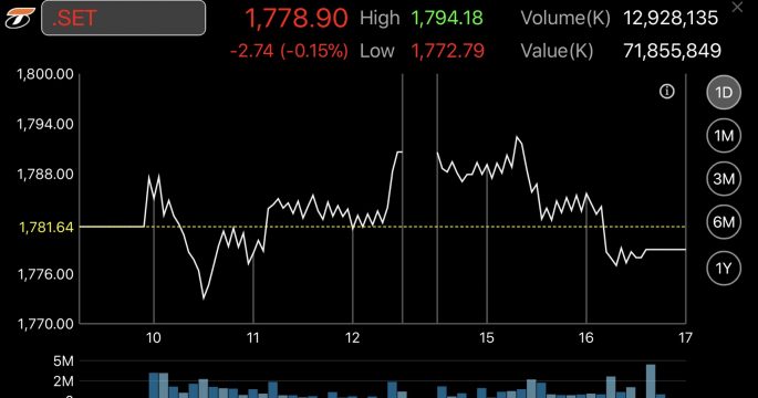 ดัชนีหุ้นไทยปิดทำการที่ระดับ 1,775.37 จุด ลดลง 3.53 จุด หรือ -0.20% มีมูลค่าการซื้อขาย 72,472.23 ล้านบาท