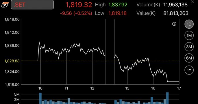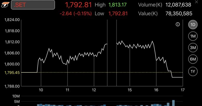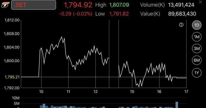 ตลาดหุ้นไทยผันผวน ปิดที่ 1,794.92 จุด ลดลง 0.29 จุด แรงซื้อหุ้นกลุ่มพลังงานประคองตลาด