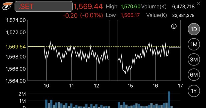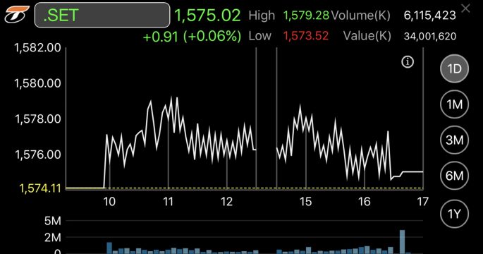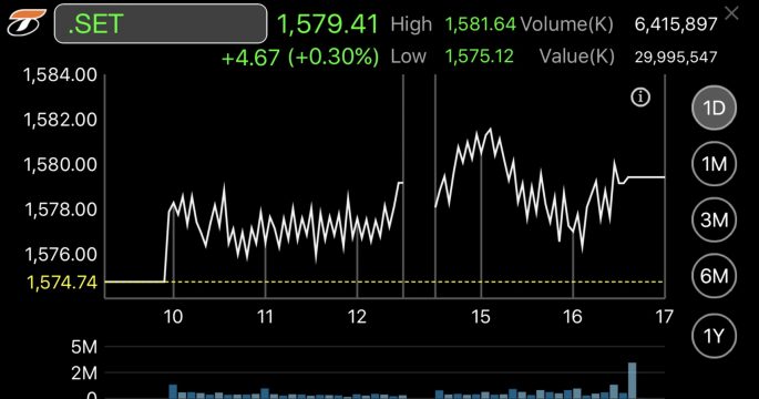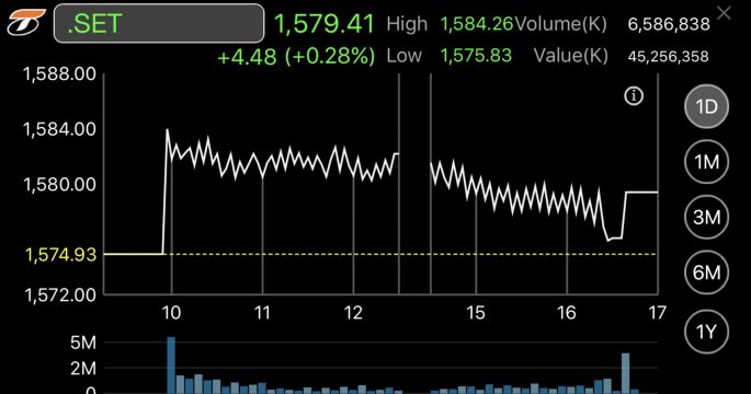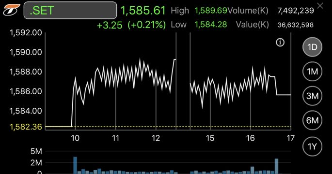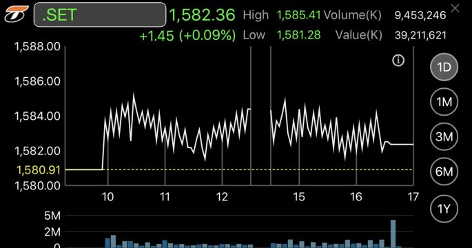 ตลาดหุ้นไทยท้ายสัปดาห์เงียบเหงา บวกเล็กน้อย 1.45 จุด ปิดที่ระดับ 1,582.36 จุด