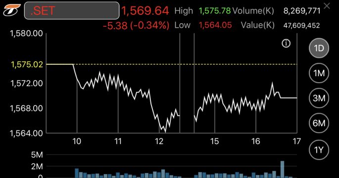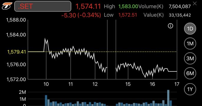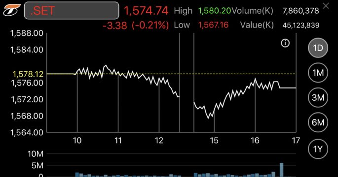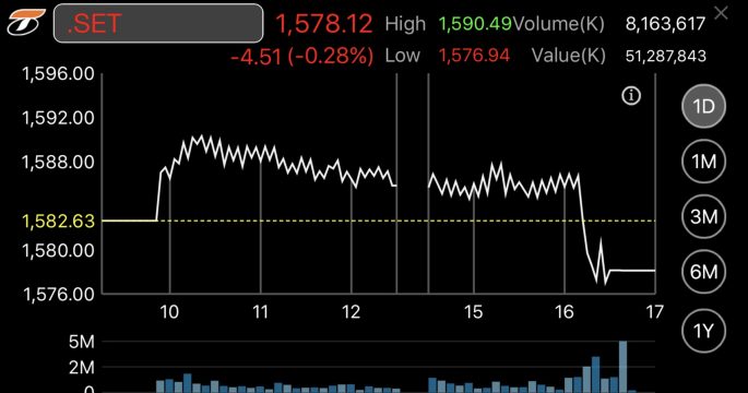 ตลาดหุ้นไทยปรับตัวลง 4.51 จุด แรงขายกลุ่มพลังงาน ปิดที่ 1,578.12 จุด