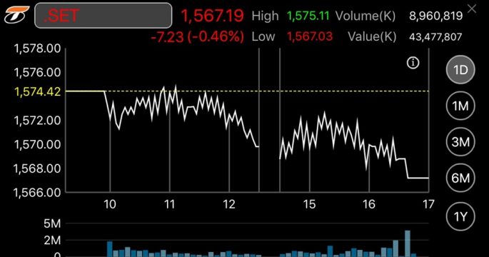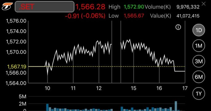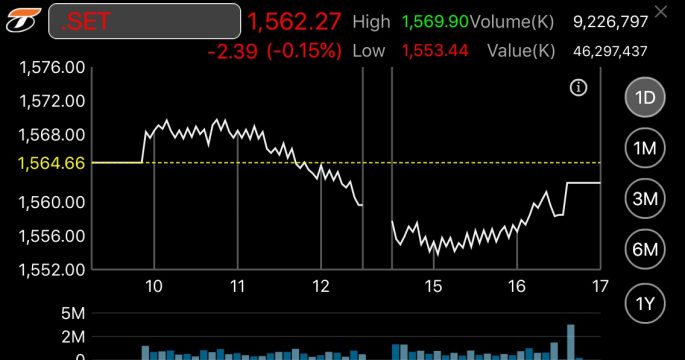หุ้นไทยลดลง 2.39 จุด ปิดที่ระดับ 1,562.27 จุด แรงขายหุ้นกลุ่มขนาดกลาง-เล็ก