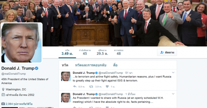ทรัมป์ทวีตว่า มีสิทธิเด็ดขาดที่จะแบ่งปันข้อมูลอ่อนไหวกับรัสเซีย หลังจากมีข่าวว่าเขาเปิดเผยข้อมูลลับให้เจ้าหน้าที่รัสเซียที่เข้าพบที่ทำเนียบขาวเมื่อสัปดาห์ก่อน