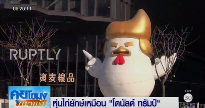 ห้างสรรพสินค้าแห่งหนึ่งในจีนเปิดตัวหุ่นไก่ขนาดยักษ์ต้อนรับปีระกาที่จะมาถึงในปีหน้า แต่เป็นไก่ที่หน้าตาดูละม้ายคล้ายคลึงนายโดนัลด์ ทรัมป์ ว่าที่ประธานาธิบดีคนใหม่ของสหรัฐ