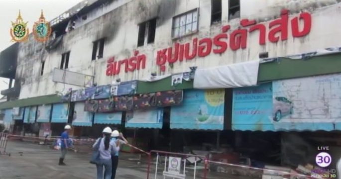 วิศวกรกรมโยธาฯ เข้าตรวจสอบความเสียหายโครงสร้างห้างลีมาร์ท เขตเทศบาลนครตรัง หลังเกิดเหตุคนร้ายลอบวางระเบิดเพลิงจนอาคารเสียหายทั้ง 4 ชั้น