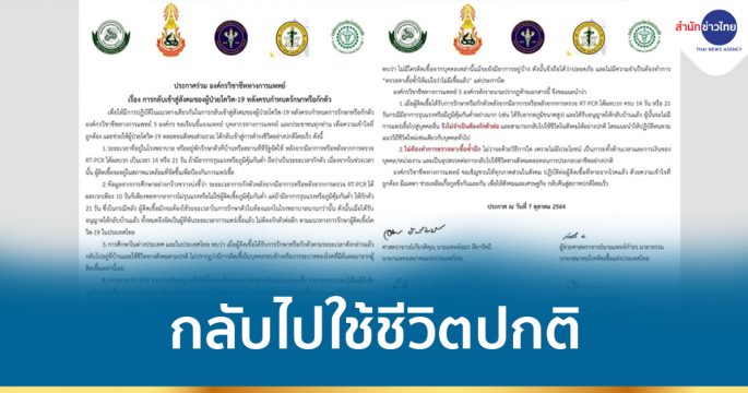 องค์กรวิชาชีพทางการแพทย์ 5 องค์กรร่วมออกประกาศเสนอให้ผู้ป่วยโควิด-19 ที่ได้รับการรักษาหรือกักตัวครบแล้ว สามารถกลับไปใช้ชีวิตในสังคมได้อย่างปกติ โดยไม่ต้องตรวจหาเชื้อซ้ำ เพราะไม่มีประโยชน์ เป็นภาระเวลาและการเงินของบุคคล หน่วยงาน
