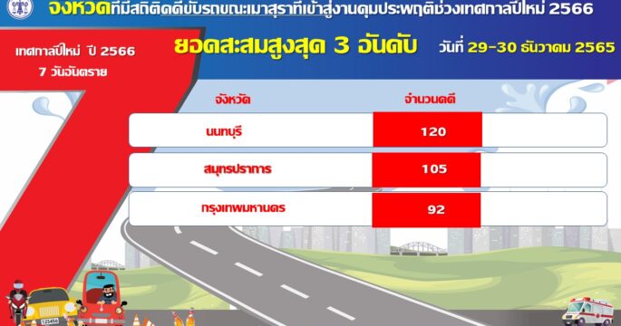 วันแรกรณรงค์ป้องกันและลดอุบัติเหตุ ช่วงเทศกาลปีใหม่ 2568 มีคดีที่ศาลสั่งคุมความประพฤติทั้งสิ้น 380 คดี เมาแล้วขับถึง 344 คดี เทียบกับปีที่แล้ว พบลดลง 171 คดี จังหวัดที่มีสถิติคดีเมาแล้วขับสูงสุด 3 อันดับ ได้แก่ เชียงใหม่ 63 คดี นนทบุรี 61 คดี และสมุทรปราการ 31 คดี
