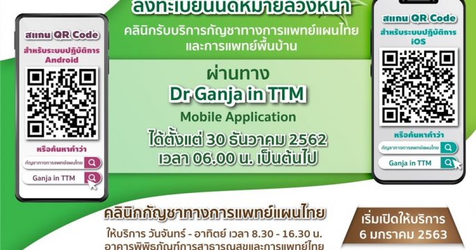 สธ.เปิดคลินิกกัญชาทางการแพทย์แผนไทยที่อาคารเรือนไทย เริ่ม6ม.ค.นี้ จองคิวล่วงหน้าผ่านแอปพลิเคชัน “กัญชาทางการแพทย์แผนไทย” “Dr.Ganja in TTM”สมาร์ทโฟนระบบแอนดรอยด์