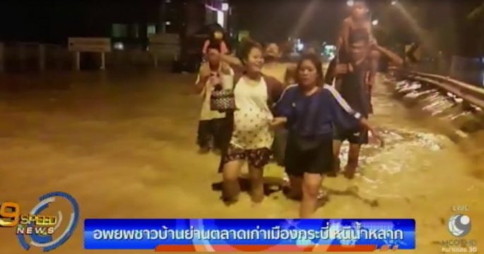 เจ้าหน้าที่เร่งอพยพประชาชนออกจากบ้านเรือนกลางดึก หลังระดับน้ำในคลองกระบี่ใหญ่ หลากเข้าท่วมชุมชนย่านตลาดเก่าอ.เมืองกระบี่ อีกระลอก