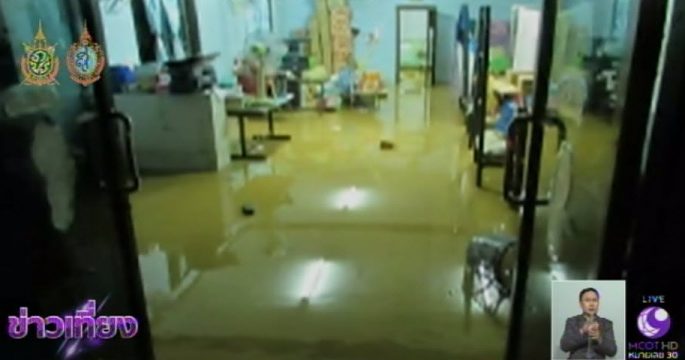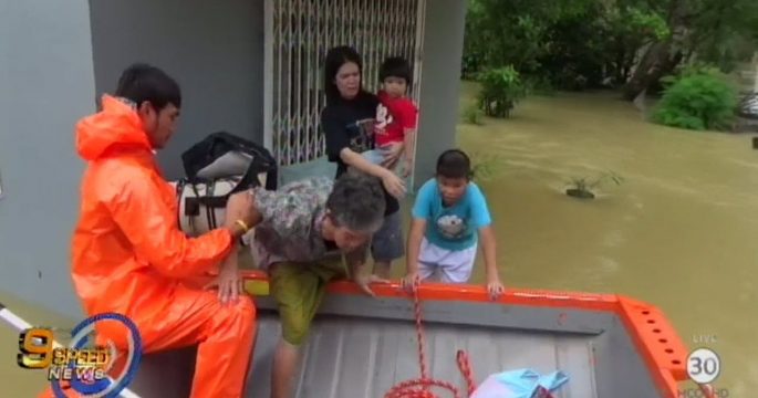 เจ้าหน้าที่อบต.นาตาล่วง อำเภอเมืองตรัง นำเรือออกรับผู้สูงอายุและเด็กออกจากบ้านพักที่ถูกน้ำท่วมสูง มีกระแสน้ำเชี่ยวกราก ต้องปิดการสัญจร