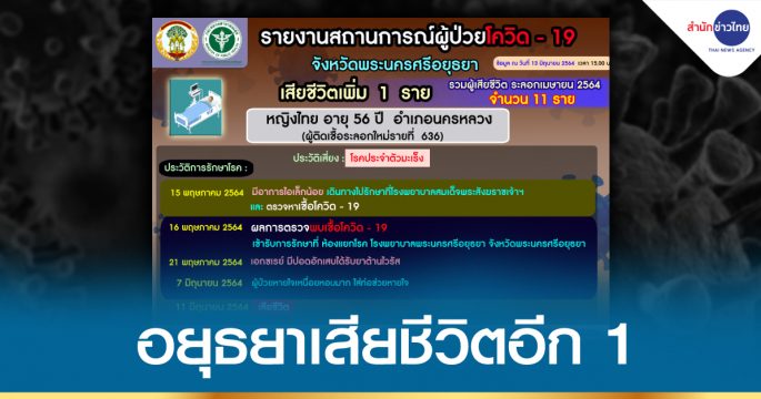 สสจ.พระนครศรีอยุธยา รายงานพบผู้เสียชีวิตจากโควิด-19 เพิ่มอีก 1 ราย เป็นประธาน อสม. มีโรคประจำตัวเป็นผู้ป่วยมะเร็ง
