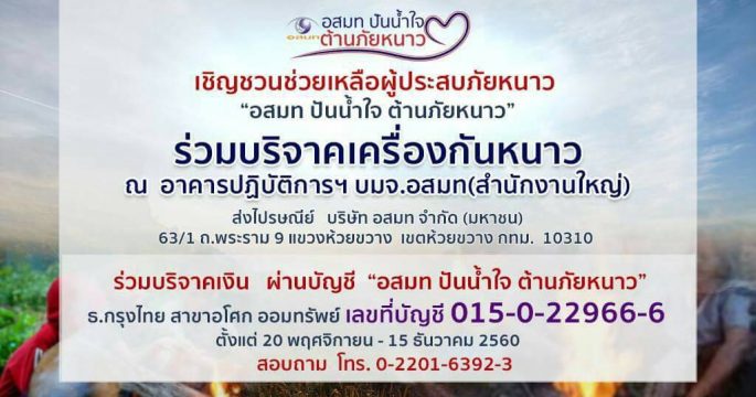 บริษัท อสมท จำกัด (มหาชน) ขอเชิญชวนร่วมช่วยเหลือผู้ประสบภัยหนาว กับโครงการ “อสมท ปันน้ำใจ ต้านภัยหนาว”