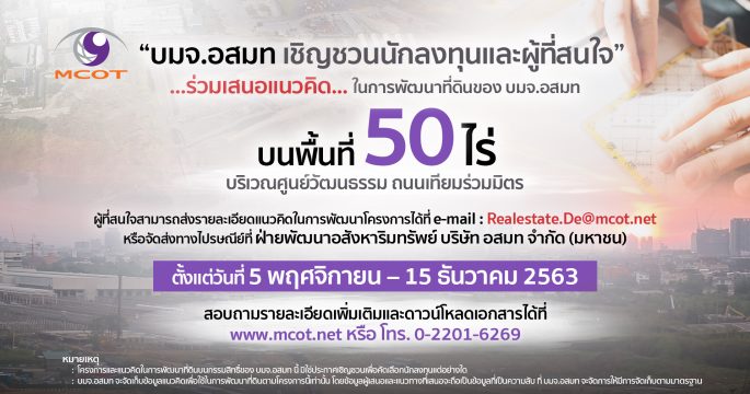 กรุงเทพฯ 6 พ.ย. – บมจ.อสมท เชิญชวนนักลงทุนและผู้ที่สนใจร่วมเสนอแนวคิดในการพัฒนาที่ดินของ บมจ.อสมท บนพื้นที่ 50 ไร่ บริเวณศูนย์วัฒนธรรม ถนนเทียมร่วมมิตร บริษัท อสมท จำกัด(มหาชน) ขอประชาสัมพันธ์เชิญชวน นักลงทุนและผู้ที่สนใจร่วมเสนอแนวคิดในการพัฒนาที่ดินกรรมสิทธิ์ของ บมจ.อสมท บนพื้นที่ 50 ไร่ บริเวณศูนย์วัฒนธรรม ถนนเทียมร่วมมิตร โดย ผู้ที่สนใจสามารถส่งรายละเอียดแนวคิดในการพัฒนาโครงการได้ที่ e-mail : Realestate.De@mcot.net หรือจัดส่งทางไปรษณีย์ที่ฝ่ายพัฒนาอสังหาริมทรัพย์ บริษัท อสมท จำกัด(มหาชน) เลขที่ 63/1 ถนนพระราม 9 แขวงห้วยขวาง เขตห้วยขวาง กรุงเทพฯ 10310 ตั้งแต่วันที่ 5 พฤศจิกายน – 15 ธันวาคม 2563 สามารถสอบถามรายละเอียดเพิ่มเติมและดาวน์โหลดเอกสารได้ที่ www.mcot.net หรือ โทร. 0-2201-6269 ทั้งนี้ โครงการและแนวคิดในการพัฒนาที่ดินบนกรรมสิทธิ์ของ บมจ.อสมท […]