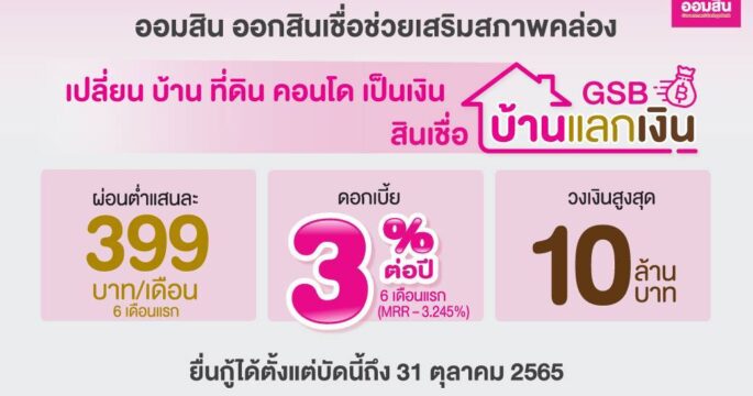ออมสิน ออกสินเชื่อช่วยเสริมสภาพคล่อง เปลี่ยน บ้าน ที่ดิน คอนโด เป็นเงิน “สินเชื่อ GSB บ้านแลกเงิน” ผ่อนต่ำ 6 เดือนแรก แสนละ 399 บาท/เดือน ให้กู้สูงสุด 10 ล้านบาท ยื่นกู้ได้ถึง 31 ต.ค.65