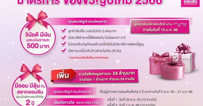 กรุงเทพฯ 20 ธ.ค.-ออมสินได้จัดของขวัญปีใหม่ 2566 ให้แก่ลูกค้าและประชาชน 2 ชิ้นใหญ่ ประกอบด้วย วินัยดี มีเงิน มอบเงินรายละ 500 บาท ให้แก่ลูกค้าสินเชื่อที่มีวงเงินกู้ไม่เกิน 200,000 บาท มีประวัติชำระหนี้ดีติดต่อกันไม่น้อยกว่า 3 ปี