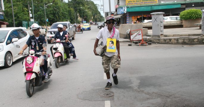 ไมเคิล แฮมมิล ชาวออสเตรเลียถือพระบรมสาทิศลักษณ์เดินจากสุราษฎร์ธานีถึงเขตชุมพรแล้ว เพื่อเข้า กทม.ถวายความอาลัย ท่ามกลางประชาชนต้อนรับให้กำลังใจอย่างดี