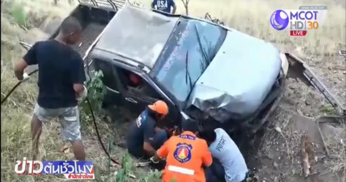 เกิดอุบัติเหตุรถกระบะแหกโค้งพลิกคว่ำทับคนขับรถอาการสาหัสบริเวณจุดทางโค้งอันตรายหลักกิโลเมตรที่ 33 ถนนสาแม่สอด-อุ้มผาง อำเภอพบพระ จังหวัดตาก เจ้าหน้าที่เข้าตรวจสอบที่เกิดเหตุ พบรถกระบะพลิกคว่ำชนต้นไม้อย่างแรง