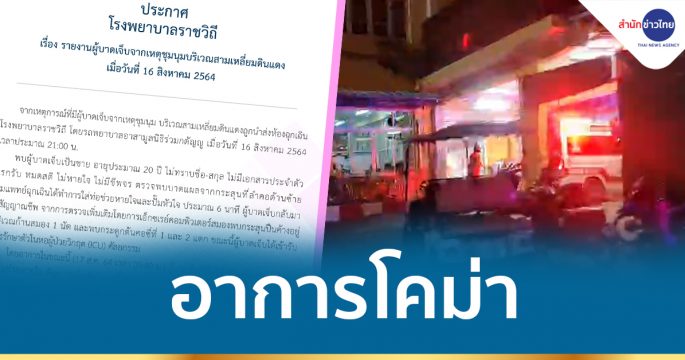 รพ.ราชวิถี ออกประกาศเผยผู้บาดเจ็บจากเหตุการณ์ชุมนุมบริเวณสามเหลี่ยมดินแดง วานนี้ (16 ส.ค.) ชายอายุ 20 ปี ไม่ทราบชื่อ อาการกลับมาวิกฤติอีกครั้ง ไม่รู้สึกตัว รอประเมินสมอง หลังปั๊มหัวใจและกลับมามีสัญญาณชีพอีกครั้ง บาดแผลจากกระสุนที่ลำคอด้านซ้าย