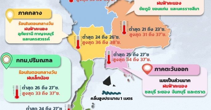 กรมอุตุฯ เผยประเทศไทยตอนบนอากาศร้อนในตอนกลางวัน ส่วนเหนือ อีสาน อากาศเย็นในตอนเช้า กรุงเทพฯ และปริมณฑล ฝนฟ้าคะนอง 20% ของพื้นที่