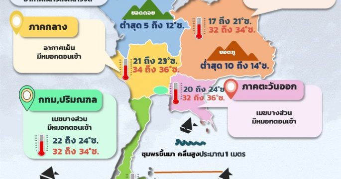 อุตุฯ เผยไทยตอนบนมีอากาศเย็นถึงหนาวกับมีหมอกในตอนเช้า ภาคเหนือ-อีสาน อุณหภูมิลดลง 1-2 องศาฯ ยอดดอย-ยอดภูอากาศหนาวถึงหนาวจัด อุณหภูมิต่ำสุด 5-14 องศาฯ