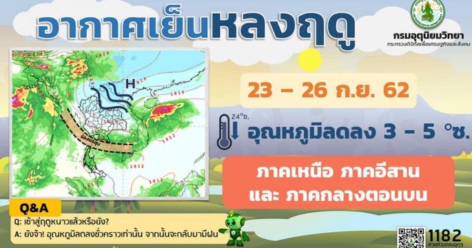 อธิบดีกรมอุตุฯ เผยประเทศไทยยังไม่เข้าหน้าหนาว ส่วนอากาศเย็นหลงฤดู ช่วง 23-26 ก.ย.นี้ เกิดจากการเปลี่ยนทิศของมวลอากาศ เป็นผลกระทบระยะสั้น