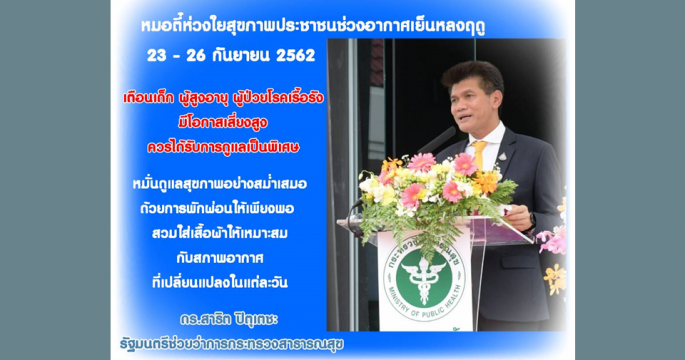 รมช.สธ.เตือนอากาศเย็นหลงฤดู ช่วง 23-26 กันยายนนี้ ทำให้เกิดโรคติดต่อได้ง่าย ชี้เด็ก – ผู้สูงอายุ- ผู้ป่วย โรคเรื้อรังมีโอกาสเสี่ยงสูง แนะควรดูแลสุขภาพเป็นพิเศษ