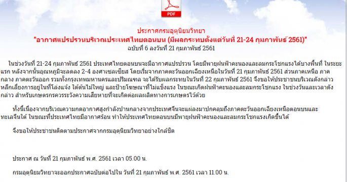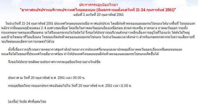 กรมอุตุนิยมวิทยา ประกาศเตือนอากาศแปรปรวนบริเวณประเทศไทยตอนบน ฉบับที่ 2 ลงวันที่ 20 กุมภาพันธ์ 2561 โดยจะมีผลกระทบตั้งแต่วันที่ 21-24 กุมภาพันธ์ 2561