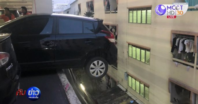 โบรกเกอร์หนุ่มขับรถขึ้นห้างเสียหลักพุ่งชนรถที่จอดอยู่ทะลุกำแพงลานจอดรถ หวิดตกลงมา โชคดีคนขับปลอดภัย