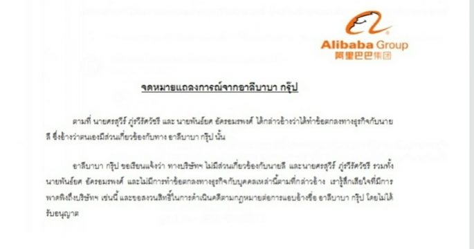 อาลีบาบา กรุ๊ป ออกแถลงการณ์ชี้แจงไม่มีส่วนเกี่ยวข้องกับ “เสี่ยบอย-นายลี” เสียใจบริษัทฯ ถูกพาดพิง จ่อฟ้องแอบอ้างชื่อทำธุรกิจ