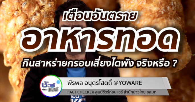 31 มกราคม 2567 – บนโซเชียลมีการแชร์อันตรายจากของทอดของมัน ทั้งเตือนห้ามกินกากหมูและสาหร่ายทอดกรอบ และหม้อทอดไร้น้ำมัน ทำให้อาหารมีสารก่อมะเร็ง ?! ศูนย์ชัวร์ก่อนแชร์ ตรวจสอบกับ รศ.ดร.เจษฎา เด่นดวงบริพันธุ์ อาจารย์ประจำ คณะวิทยาศาสตร์ จุฬาลงกรณ์มหาวิทยาลัย ผศ.ดร.อิทาวุธ สรรพวรสถิตย์ ภาควิชาเทคโนโลยีทางอาหาร คณะวิทยาศาสตร์ จุฬาลงกรณ์มหาวิทยาลัย ผศ.ดร.กิตณา แมคึเน็น อาจารย์ภาควิชาโภชนาการและการกำหนดอาหาร คณะสหเวชศาสตร์ จุฬาลงกรณ์มหาวิทยาลัย ผศ.นพ.สุรศักดิ์ กันตชูเวสศิริ กรรมการบริหารสมาคมโรคไตแห่งประเทศไทย ผศ.ดร.ชนิพรรณ บุตรยี่ สถาบันโภชนาการ มหาวิทยาลัยมหิดล รศ.ดร.ธัญญารัตน์ จิญกาญจน์ อาจารย์ภาควิชาเทคโนโลยีการบรรจุและวัสดุ คณะอุตสาหกรรมเกษตร มหาวิทยาลัยเกษตรศาสตร์ ดร.มลฤดี สุขประสารทรัพย์ อาจารย์หลักสูตรพิษวิทยาและโภชนาการเพื่ออาหารปลอดภัย สถาบันโภชนาการ มหาวิทยาลัยมหิดล ตรวจสอบข้อเท็จจริง โดย พีรพล อนุตรโสตถิ์