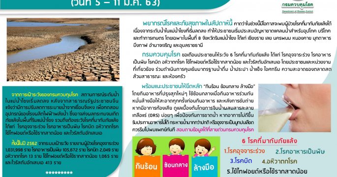 เตือนประชาชนโดยเฉพาะในพื้นที่ 8 จังหวัดริมแม่น้ำโขง ได้แก่ เชียงราย เลย นครพนม หนองคาย มุกดาหาร บึงกาฬ อำนาจเจริญ และอุบลราชธานี ให้ระวังโรคที่มากับภัยแล้ง
