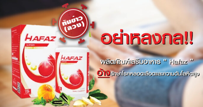 อย.เตือนผู้บริโภคอย่าหลงเชื่อผลิตภัณฑ์เสริมอาหาร Hafaz อ้างรักษาโรคหลอดเลือดและความดันโลหิตสูงทางสื่อออนไลน์ เป็นการแอบอ้างสรรพคุณเกินจริง และไม่ได้รับอนุญาตโฆษณาจาก อย.