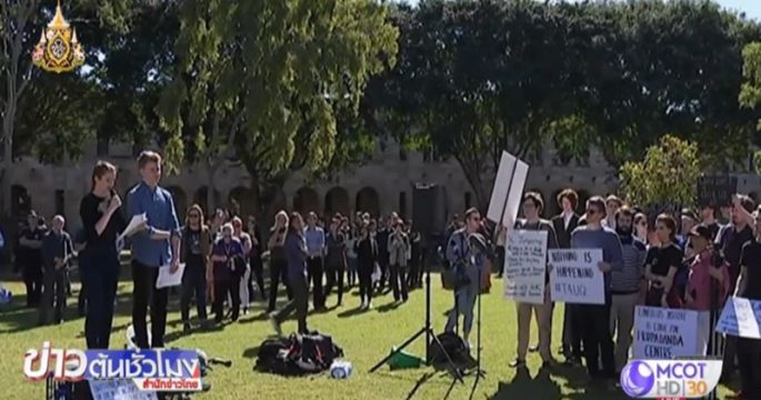 กลุ่มผู้ประท้วงราว 100 คน รวมตัวชุมนุมที่มหาวิทยาลัยควีนส์แลนด์ของออสเตรเลีย เพื่อประท้วงต่อต้านการแผ่อิทธิพลของจีน