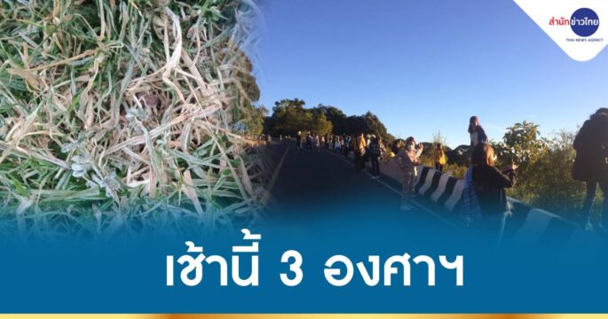 ยอดดอยเย็นยะเยือก อุณหภูมิลดอีก อินทนนท์แหล่งท่องเที่ยวในเชียงใหม่ ต่ำสุดยอดหญ้าเมื่อกลางดึกแตะ 0 ถึงติดลบ เช้านี้ยังมีน้ำค้างแข็ง ส่วน จ.เลย เย็นจัดอำเภอนาแห้วติดลบ 1-2 องศาฯ น้ำค้างแข็งเกาะท้องทุ่งกลางหุบเขา เป็นครั้งแรกฤดูหนาวปีนี้