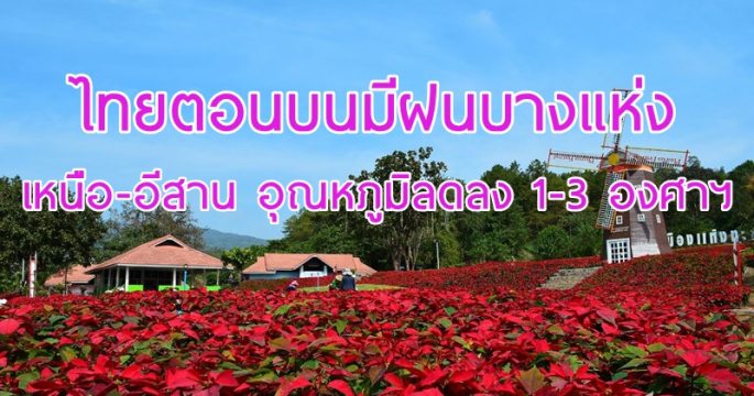 กรมอุตุฯ เผยไทยตอนบนมีฝนบางแห่ง ส่วนเหนือ อีสาน เช้าอากาศเย็น อุณหภูมิจะลดลง 1-3 องศาฯ ด้านกรุงเทพฯ และปริมณฑล มีฝนฟ้าคะนอง 10% อุณหภูมิจะลดลง 1-2 องศาฯ