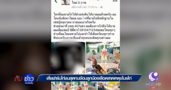 เสี่ยฟาร์มไก่ชนอุดรธานีสุดทนทำร้ายลูกน้องขโมยไก่ชนพันธุ์ดีจำนวน 12 ตัวไปขายมูลค่ากว่า 2 แสนบาท