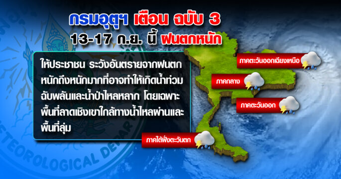 กรมอุตุฯ เตือน 13-17 กันยายนนี้ ฝนตกหนักถึงหนักมากหลายพื้นที่ ขณะที่พายุโซนร้อน “เบบินคา” ที่คาดว่าจะขึ้นฝั่งประเทศจีน ยังไม่กระทบไทย